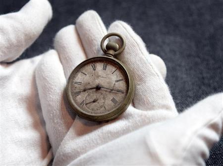 運命の8時15分。二川謙吾さん(当時59)は、爆心地から1600メートルで被爆した。右肩から背後および頭部に大やけどを負い、8月22日に死亡した。この時計は息子の一夫さんから贈られた大切なもので、肌身離さず持ち歩いていた(広島平和記念資料館収蔵資料「懐中時計」二川一夫氏寄贈)2015年7月22日(奈須稔撮影)