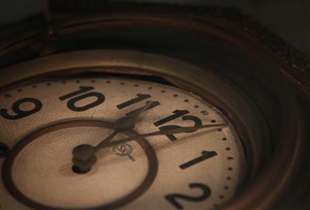 長崎原爆資料館に展示されている原爆投下時刻の午前11時2分を指したまま止まった柱時計。爆心地から南へ約2.8キロの民家で見つかった=2015年8月1日、長崎県長崎市(松本健吾撮影)