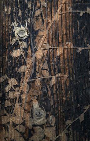 長崎原爆資料館に展示されている爆心地から約1.4キロにあった民家の板壁。熱線が直接当たっていた部分は焼けていないのが分かる=2015年7月31日、長崎県長崎市(松本健吾撮影)
