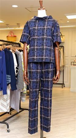 Muveil_Workのシャツ素材のトップス(2万9000円)とパンツ(3万5000円)のセットアップ。トレンドのチェックに、小花模様を浮かせた凝ったデザイン=2015年7月30日、東京都中央区銀座の松屋銀座(野村成次撮影)
