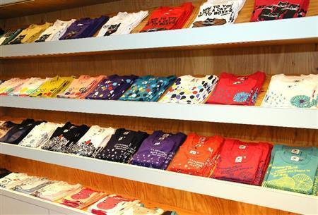京都のランドマークや街並みをデザインしたユニークなTシャツは、中国人観光客が爆買いするなど大人気だ=2015年8月11日、京都市中京区(志儀駒貴撮影)