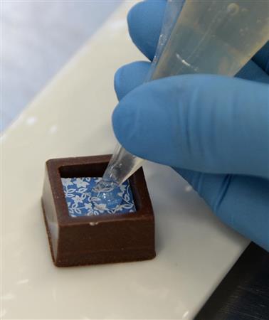 パティシエがこのお店のキッチンで一つ一つ丁寧に手作りする「瑞穂(みずほ)のしずく」。これは「京都日本酒」(全5種類)のなかの「古都千年」(斎藤酒造)。ブルーが鮮やかだ=2015年9月28日、京都市中京区(岡本義彦撮影)