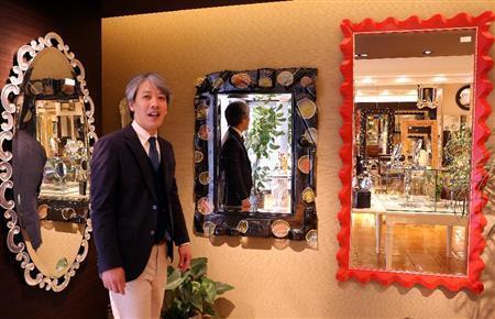 フレームにも凝ったアート作品のような壁掛け鏡も多い=2015年11月13日、京都市下京区(志儀駒貴撮影)