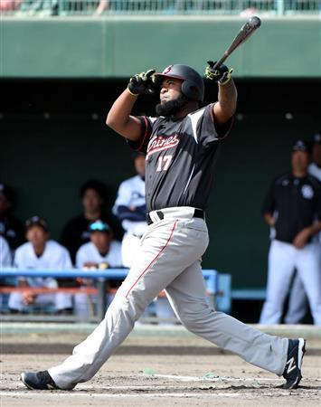 一回、2ランHRを放ったロッテ、ヤマイコ・ナバーロ=2016年2月20日、沖縄県中頭郡北谷町の北谷公園野球場(森本幸一撮影)