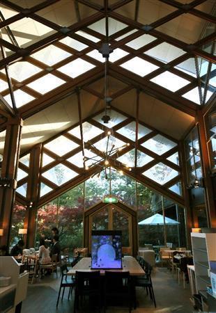 高い吹き抜けと大きな窓ガラスで外の景色も楽しめる店内。真ん中の大きなテーブルには水槽がしつらえてある=2015年12月8日、京都市下京区(志儀駒貴撮影)