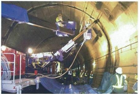 トンネルの強度補修作業。内壁に長さ3メートルの巨大ボルトを打ち込む(JR東海提供)【拡大】