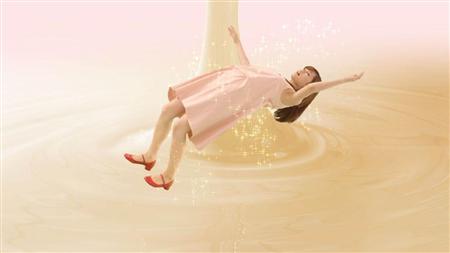 メルヘンチックな風景の中、ペコちゃんと2人でベンチに腰掛ける前田さんは、生ミルキーの甘やかな味わいを全身で表現するかのようなピンク色のワンピース姿。一粒口に入れた前田さんは嬉しい驚きの表情を浮かべ、背景が生クリームたっぷりの世界へと変わる。