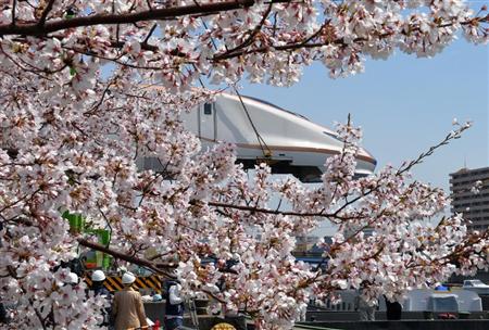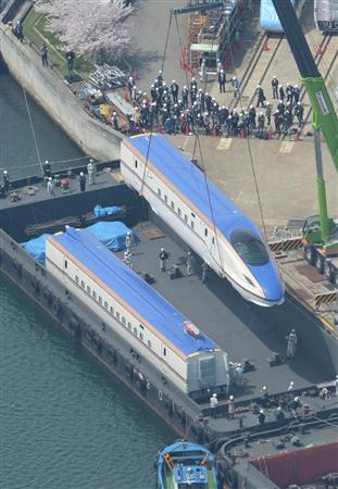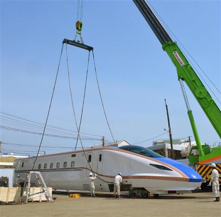 来春に長野-金沢間の延伸開業でデビューする北陸新幹線の新型車両「W7系」が7日、川崎重工業兵庫工場(神戸市兵庫区)からJR西日本白山総合車両所(石川県白山市)に向けて搬出され、報道陣に公開された。
