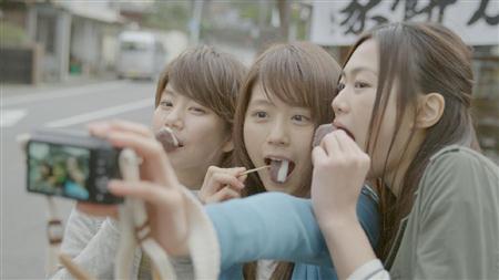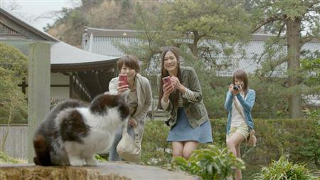 CMは、鎌倉を舞台に有村さんが女友達2人と旅行しているという設定。有村さんがデジカメで撮った楽しい瞬間の写真をその場で友達のスマホに送り、シェアする様子が描かれている。人力車に乗ったシーンや、お寺や海岸で女友達とはしゃぐ有村さんのいきいきとした明るい表情がとても印象的だ。