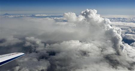 御嶽山の噴火で、上空に立ち上る噴煙=27日午後2時6分、共同通信社機から【拡大】