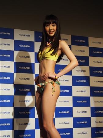 同社によると、今年の水着商戦は日焼けに配慮してワンピースなど露出を抑えた形が流行する見込み。山下さんは同社の素材を使った水着姿も披露し、「動きやすくて着心地がいい」と早速アピールしていた。