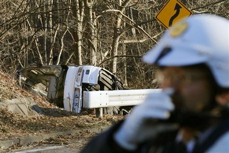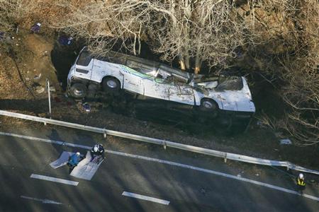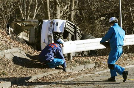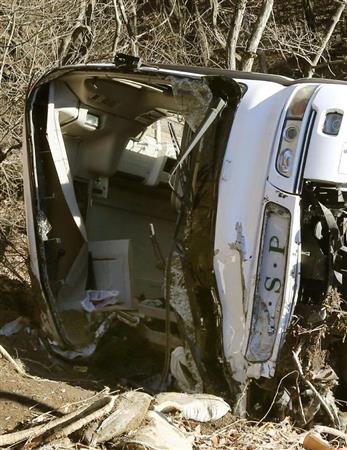 国道から転落、横転したスキーバス=15日午前8時31分、長野県軽井沢町(共同通信社ヘリから)【拡大】