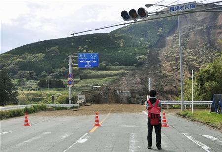 地震で寸断された熊本県南阿蘇村の国道57号線=16日午後【拡大】