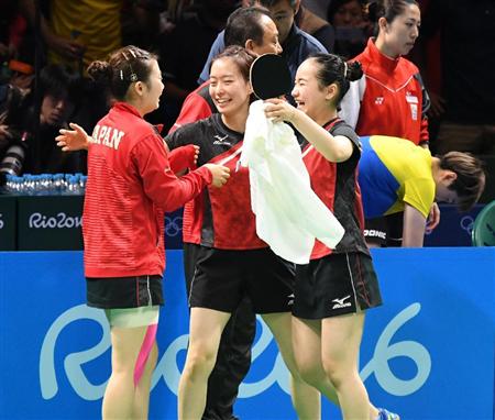 リオデジャネイロ五輪は大会第12日の16日、リオ中央体育館で卓球女子団体の3位決定戦を行い、石川佳純(全農)福原愛(ANA)伊藤美誠(スターツ)で臨んだ日本はシンガポールに3-1で勝利し、銅メダルを獲得した。日本はロンドン大会の卓球女子団体で銀メダルを手にしており、2大会連続メダルとなった。。