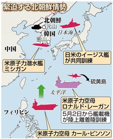 (3)日本海における、カール・ビンソンを核とする米空母打撃群と海自や韓国海軍との共同訓練。