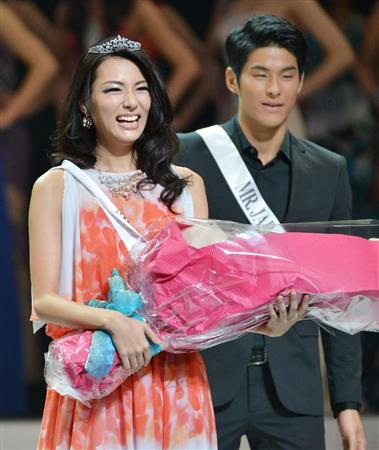 ミス・ユニバース・ジャパンに輝いた松尾幸実さん。後方はミスター・ジャパンの鈴木貴之さん=東京・丸の内
