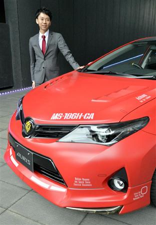 シャア専用オーリスと、企画したトヨタマーケティングジャパンの柳澤俊介さん=神戸市中央区の兵庫県立美術館(甘利慈撮影)