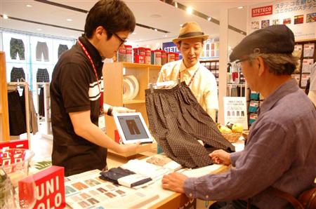 顧客にステテコの楽しみ方をアドバイスするステテコバーテンダー=東京都中央区のユニクロ銀座店