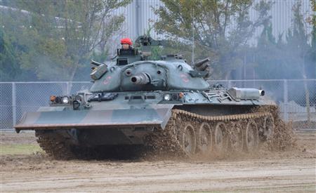 第13戦車中隊の74式戦車。戦後第2世代の主力戦車で、敵弾を逸らせる目的の傾斜装甲が特徴。車体前部にオプションの排土板(ドーザー)を装着している