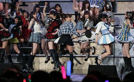 サプライズ人事の連続となった「大組閣祭り」の最後は、卒業を控えた大島優子を中心にみんなで熱唱。グループの未来へ向かってジャンプした=東京・青海(撮影・中井誠)