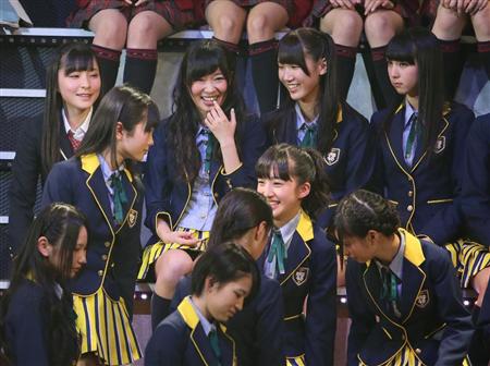 メンバーを笑顔で見つめる指原莉乃(上段左から2人目)=24日午後、東京・青海(撮影・中井誠)