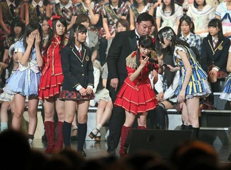 チームSリーダーの就任が決まった宮澤佐江(SNH48兼任=イベントは欠席)に電話で報告をする副リーダーの佐藤実絵子(中央)=24日午後、東京・青海(撮影・中井誠)