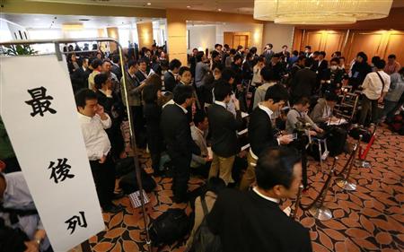 小保方氏の会見会場前には大勢の報道陣が列をつくった=9日午前、大阪市北区(松永渉平撮影)