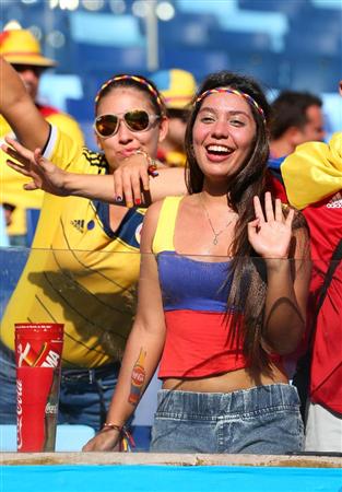 日本戦で声援を送るコロンビアのサポーター=現地時間24日、クイアバのパンタナル・アリーナ(ArenaPantanal)(撮影・吉澤良太)