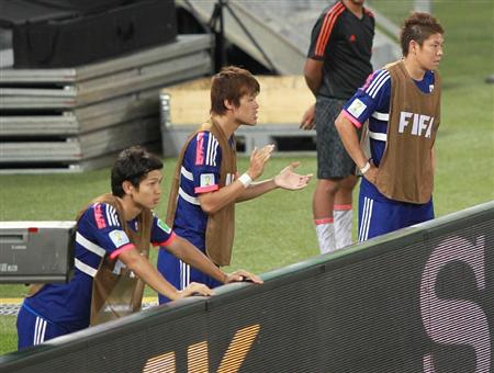 後半、ゴール裏でアップしながら声援を送る森重真人、酒井宏樹、伊野波雅彦(左から)=現地時間24日、ブラジル・クイアバのパンタナル・アリーナ(ArenaPantanal)(撮影・山田喜貴)