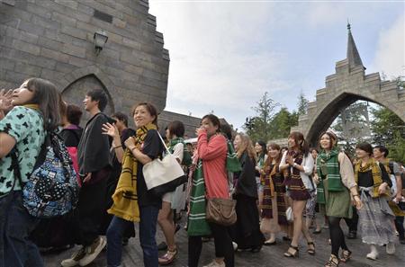 ユニバーサルスタジオ・ジャパンの新エリア「ザ・ウィザーディング・ワールド・オブ・ハリーポッター」が開業。いち早く新エリアを楽しむ入場者ら=15日午前、大阪市此花区(甘利慈撮影)
