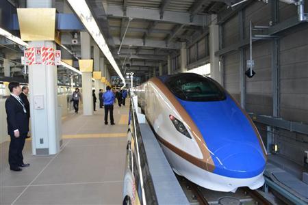 ホームの柱が金箔で彩られた金沢駅に停車する北陸新幹線E7系=石川県金沢市