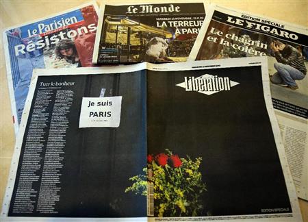 パリ同時多発テロを報じる地元紙。中央のリべラシオン紙は黒塗りの見開きに花束だけの紙面で報じた=15日、フランス・パリ(大西正純撮影)