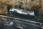 国道から転落、横転したスキーバス=15日午前8時45分、長野県軽井沢町