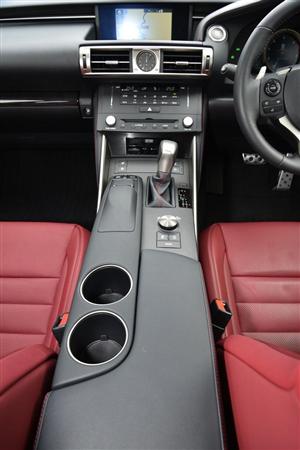 レクサスIS200t。高めのセンターコンソール。カップホルダーの位置が高すぎるのが難点
