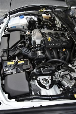 左横から。エンジンが前輪の軸より後ろ、つまり車体中央寄りに配置されていることがわかる。重量のある部品を車体中央に集めて走行性を高めている。マツダロードスター