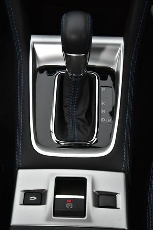 シフトレバーはDレンジに入れて右に倒すと、パドルシフトを使ったマニュアルモードに切り替わる。パーキングブレーキは電磁式。スバル・レヴォーグ