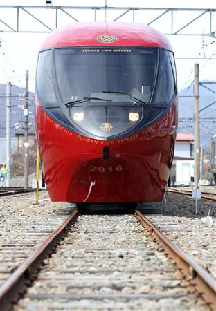 富士急行が創立90周年を記念して8500系新型「富士山ビュー特急」を公開=6日午前、山梨県富士河口湖町(桐原正道撮影)