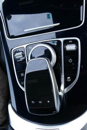 インフォテインメントシステムのコントローラー。マウスっぽく見えるのがアームレスト、その下のダイヤル兼ジョイスティック。メルセデス・ベンツGLC