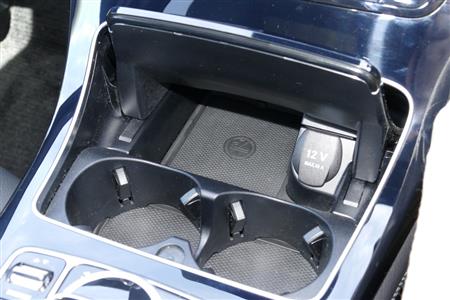 ふたを開ければ12ボルトのアクセサリーソケットとカップホルダー×2。ダンパーが効いていてふたの開き方が上品。メルセデス・ベンツGLC