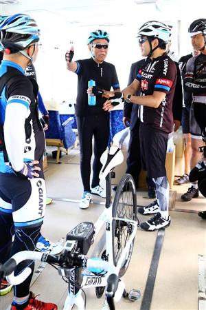 観光船に乗船し、自転車の積載方法について話し合うジャイアントの劉金標会長ら(産経デジタル澤野健太撮影)