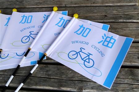 琵琶湖周辺の自治体は、ジャイアントの劉金標会長ら一行を特製の小旗で応援(産経デジタル澤野健太撮影)