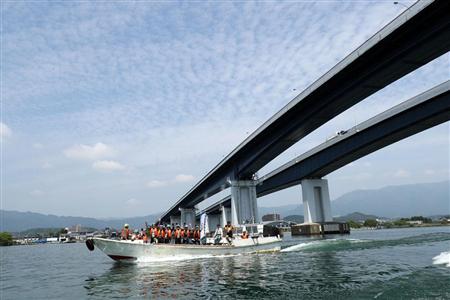舟に乗って琵琶湖大橋をくぐる劉金標ジャイアント会長らの一行(ジャイアント提供)