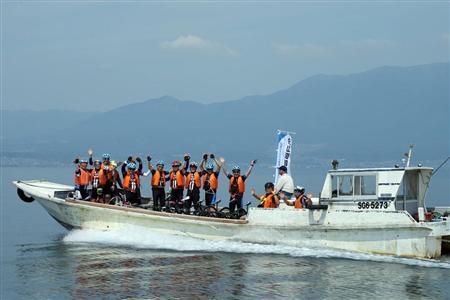 「漁船タクシー」で琵琶湖を進む劉金標会長らジャイアント視察団の一行(産経デジタル澤野健太撮影)
