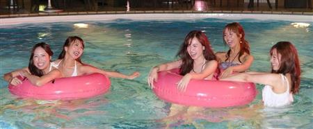 ホテルニューオータニ大阪でナイトプールがオープン、大阪城が望めるプールで遊ぶ水着ギャル=7月14日夜、大阪市中央区(宮沢宗士郎撮影)