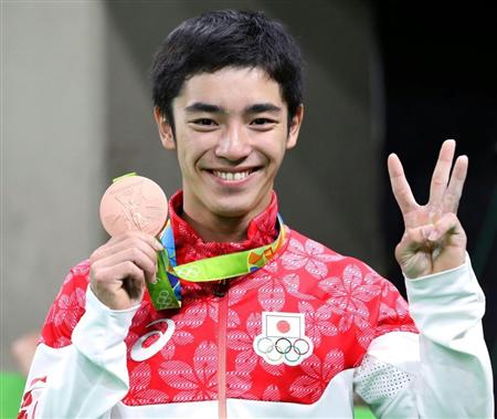 体操男子種目別の跳馬決勝で新技を決め、銅メダルを獲得した白井健三=15日、リオデジャネイロ(桐山弘太撮影)