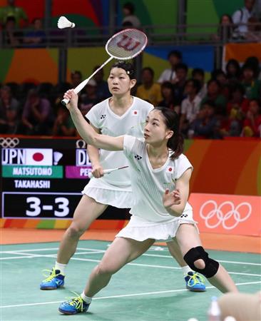 【リオデジャネイロ五輪2016】バドミントン女子ダブルス決勝、第1セット、打ち返す、松友美佐紀(手前)と高橋礼華=18日、リオ中央体育館(撮影:森田達也)