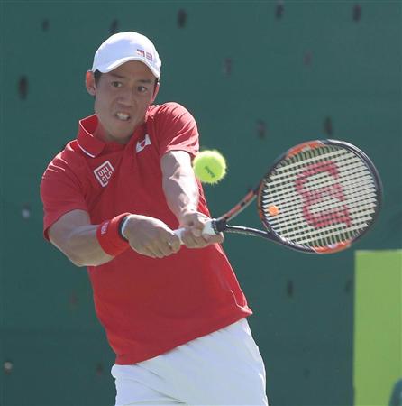 男子テニスシングルス・3位決定戦第1セット、リターンショットを放つ錦織圭=14日、五輪テニスセンター(撮影・大橋純人)