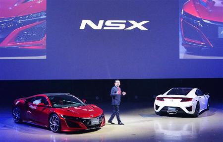 高級スポーツカーの新型「NSX」について説明するホンダの八郷隆弘社長=25日午前、東京都江東区(寺河内美奈撮影)