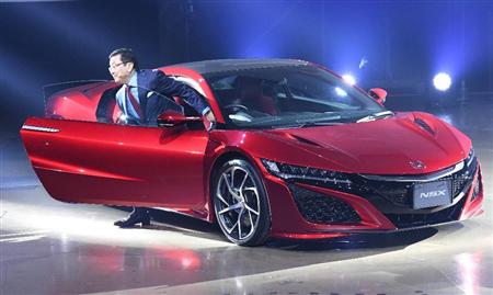 ホンダが発表した高級スポーツカーの新型「NSX」に乗って登場した八郷隆弘社長=25日午前、東京都江東区(寺河内美奈撮影)