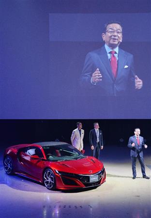 高級スポーツカーの新型「NSX」について説明するホンダの八郷隆弘社長=25日午前、東京都江東区(寺河内美奈撮影)